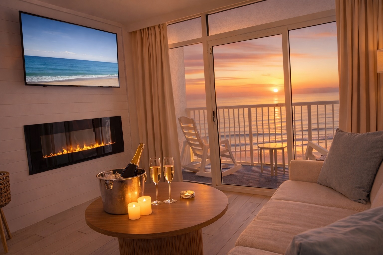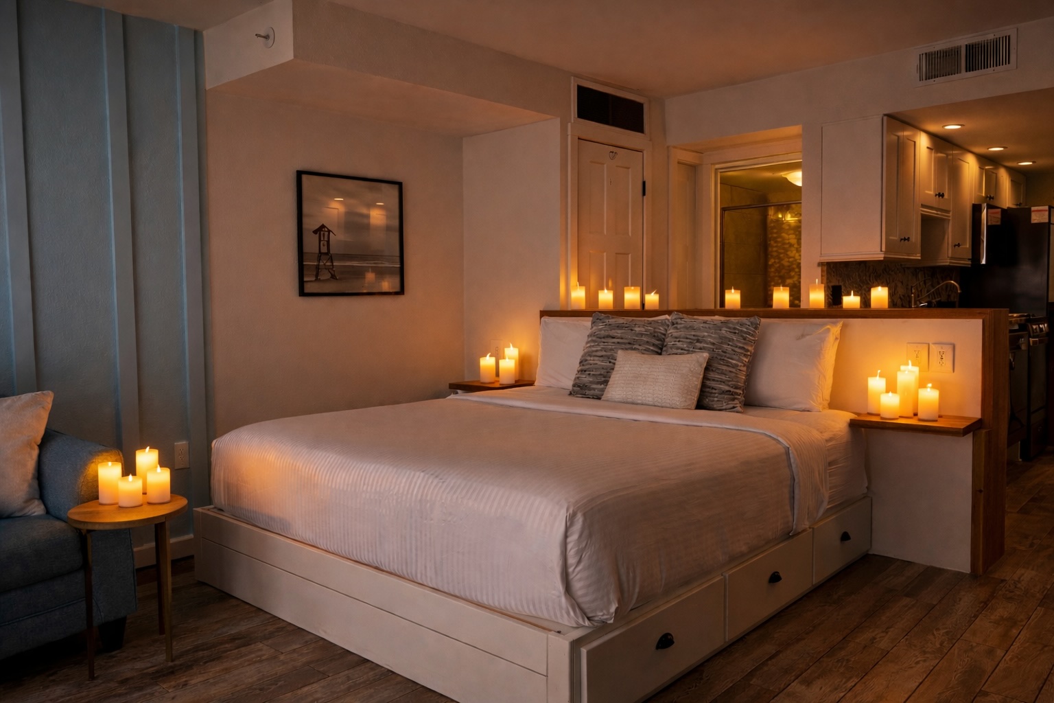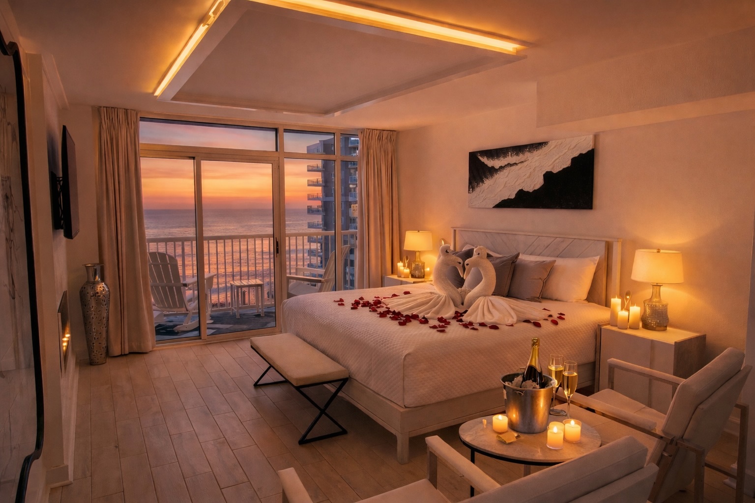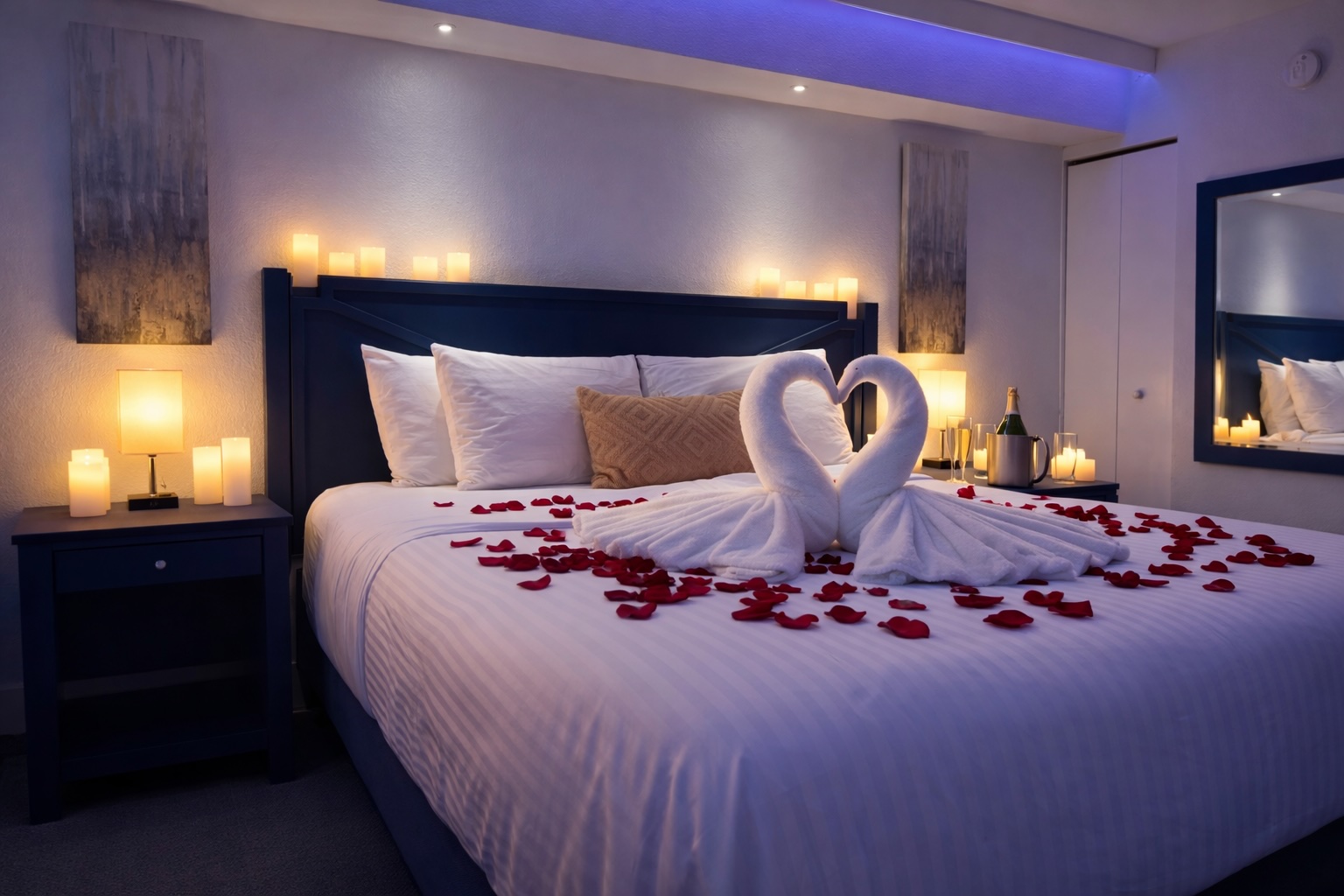 A fuller romantic setup designed to make the room feel special the moment you arrive.